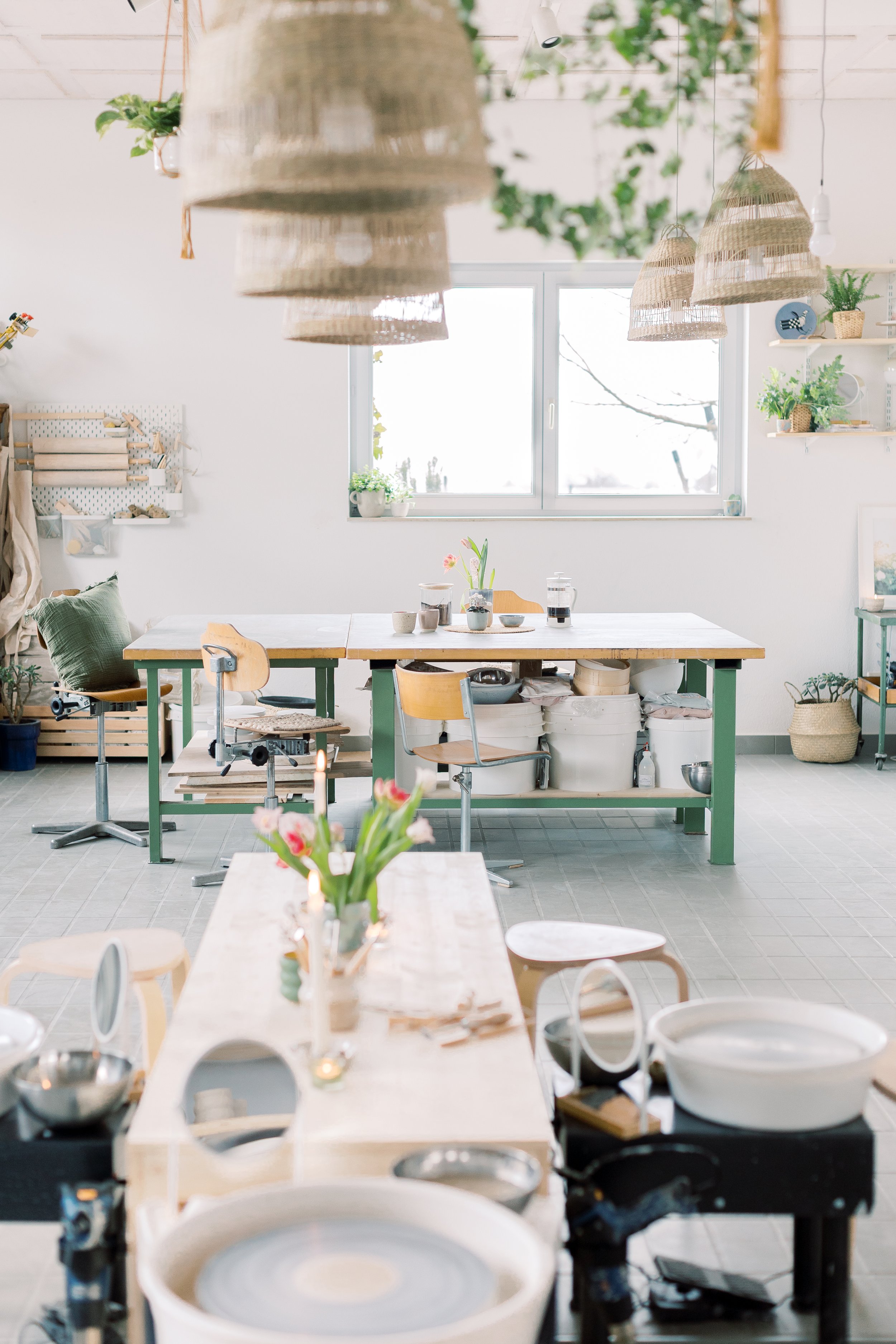 Du arbeitest selbstständig an der Drehscheibe in kreativer Studioatmosphäre. Eine intensive Betreuung wie im Kurs gibt es hier nicht – Grundkenntnisse im Zentrieren, Hochziehen und im Umgang mit Werkzeugen werden vorausgesetzt. Bei kurzen Fragen helfe ich dir selbstverständlich weiter.